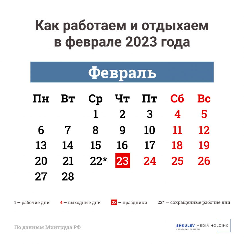 В ведомстве отметили, что рабочий день 22 февраля сократят на час, так как он является предпраздничным. Также в Роструде сообщили, что для тех, у кого шестидневка, суббота (25 февраля) будет рабочим днем.