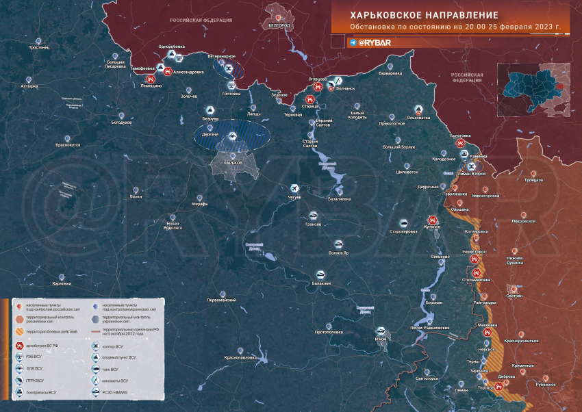Обстановка на Харьковском направлении по состоянию на 20.00 25 февраля 2023 года от Телеграм-канала «Рыбарь»
