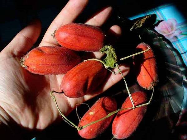 Восточные сорта отличаются необычным внешним видом. Момордика, второе название индийского огурца, имеет плоды, которые со временем меняют свой цвет. Сначала они оранжевые, но потом обретают зеленые тона вплоть до насыщенного темно-зеленого. А семена у них ярко-малиновые. Благодаря приятному вкусу и необычному внешнему виду их часто используют в кулинарии.