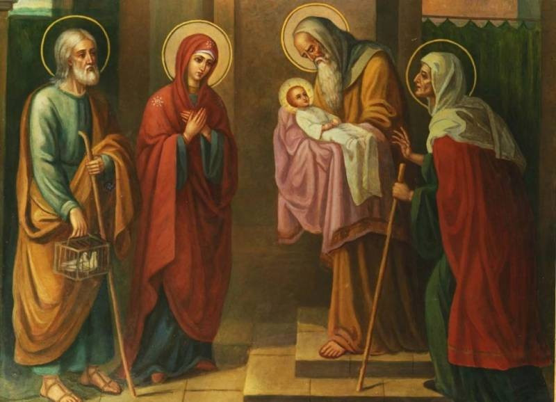 В церковных преданиях описывается история Сретения. В них говорится, что через 40 дней после появления на свет Мессии праведные Мария и Иосиф, соблюдая Моисеевы законы, понесли Младенца Иисуса в Вифлеем, в Иерусалимский храм, чтобы посвятить Его Богу. Тогда принято было делать жертвоприношения, а поскольку родители Иисуса были бедными, они принести в храм двух голубей.