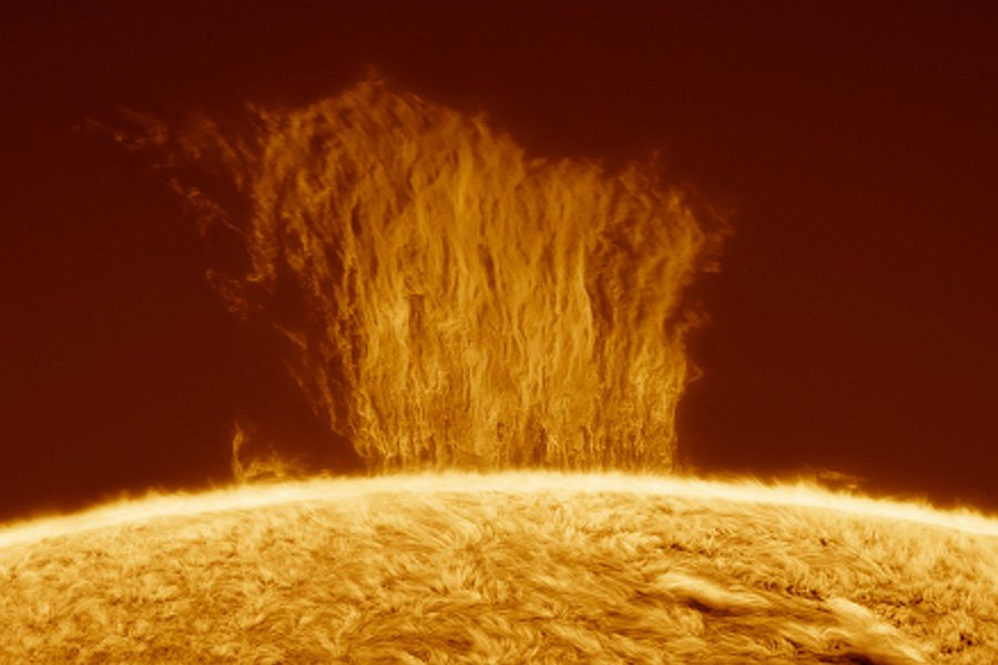 Астрофотограф сделал потрясающий снимок огромной стены плазмы, падающей на поверхность Солнца с невероятно высокой скоростью после того, как ее выплюнуло вблизи южного полюса Солнца. Эдуардо Шабергер Пупо, базирующийся недалеко от Рафаэлы в Аргентине, 9 марта сделал поразительный снимок с использованием специализированной фототехники. Плазменная стена «поднялась примерно на 100 000 км над поверхностью Солнца. Для сравнения – это высота восьми планет Земля, сложенных друг на друга.