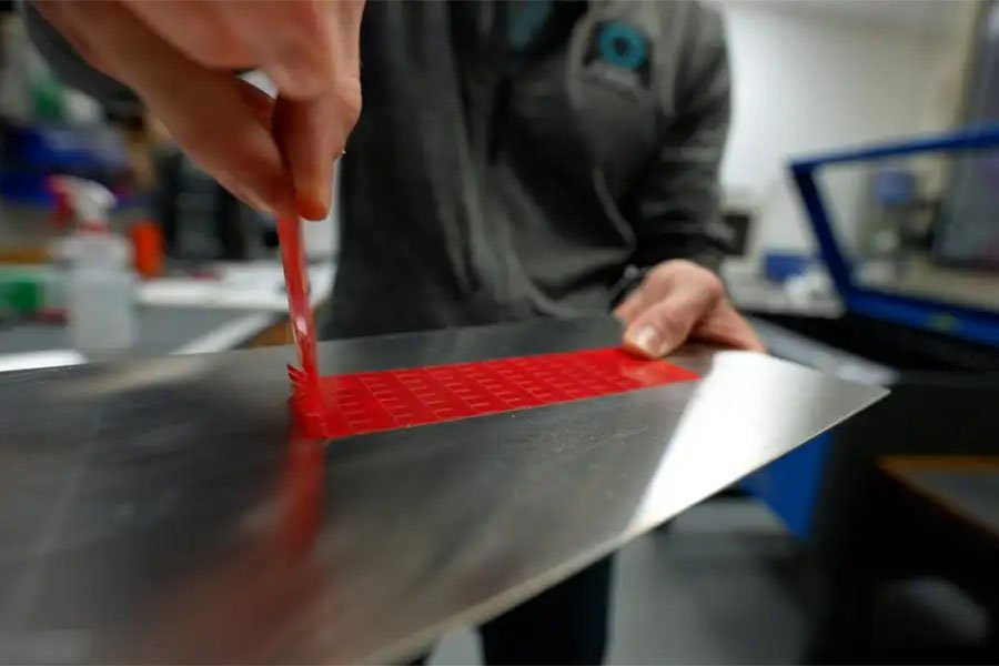 Чтобы создать ленту, команда вырезала лазером три стороны прямоугольника по повторяющемуся шаблону в полосе липкой ленты, чтобы получились клапаны. Если оторвать его от поверхности, чтобы сначала столкнуться с неразрезанной стороной прямоугольника, его легко отделить.