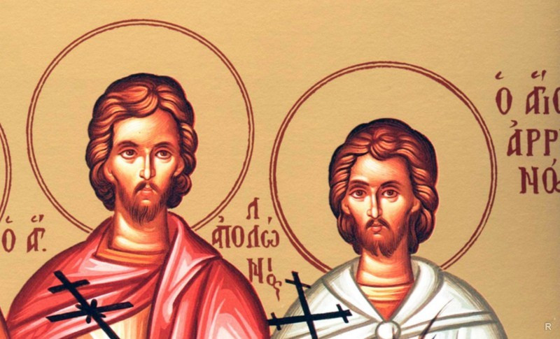 В мучениях христианских святых Аполлония и Филимона принимал участие язычник Ариан, который на протяжении многих лет боролся с людьми, уверовавшими в Единого Бога. Однако, когда он смог прахом святых исцелить свои больные глаза, Ариан также принял решение креститься и начать бороться за убеждения христиан. К нему присоединился телохранитель Феотих. Мужчины также приняли мученическую смерть.