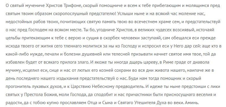 Читать молитвы святому Трифону можно, согласно молитвеннику, но позволительно молиться и от себя. Главное, чтобы эти слова были искренними и шли от самого сердца. Важно молиться святому Трифону не только 14 февраля, но и каждый день до тех пор, пока желаемое не станет явным. Многие люди убеждены, что именно молитвы к Трифону являются исцеляющими, поскольку достаточно часто помогают человеку в жизни.