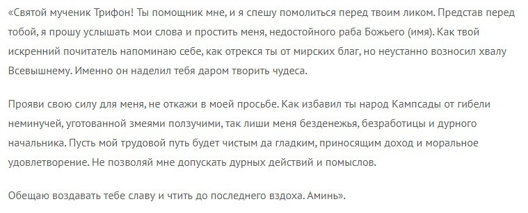 Святой Трифон помогает многим людям, которые обращаются к нему с молитвой. Чаще всего к праведнику обращаются с просьбами: